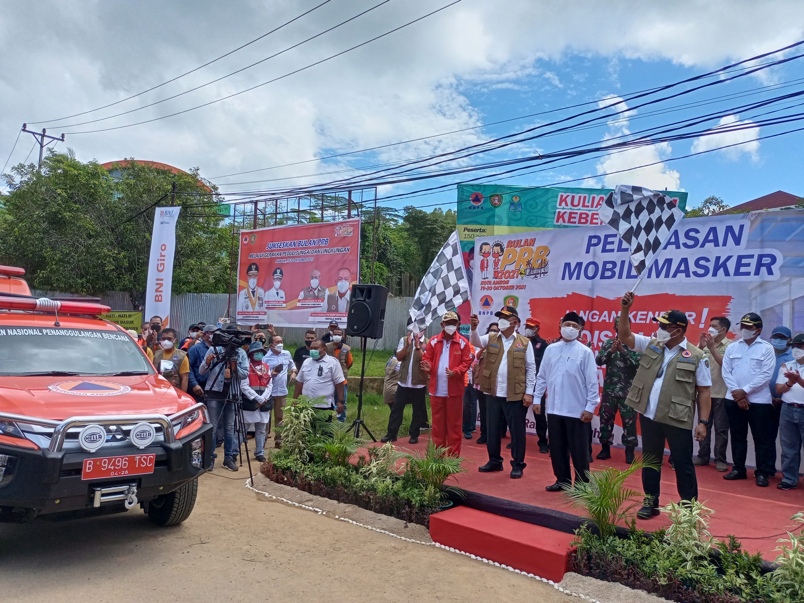 AMBON,MRNews.com,- Badan Nasional Penanggulangan Bencana (BNPB) memberi dukungan penguatan protokol kesehatan (Prokes) kepada pemerintah daerah Maluku, khususnya Kota Ambon dan sekitarnya dengan meluncurkan gerakan mobil masker untuk masyarakat.