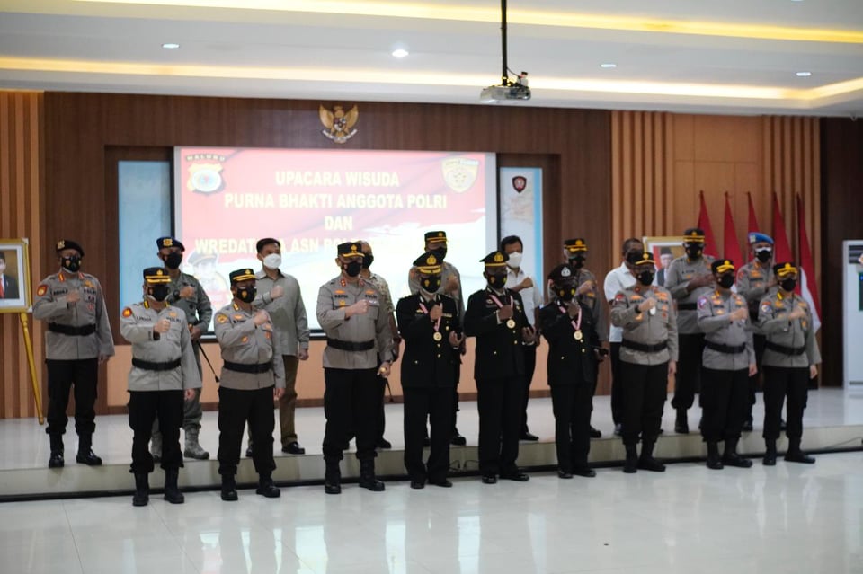 AMBON,MRNews.com,- Sebanyak 18 anggota dan 2 Aparat Sipil Negara (ASN) Polri yang bertugas di Polda Maluku resmi dilepas dalam upacara tradisi wisuda Purna Bhakti dan Wredatama ASN Polri periode Januari-Agustus 2021.