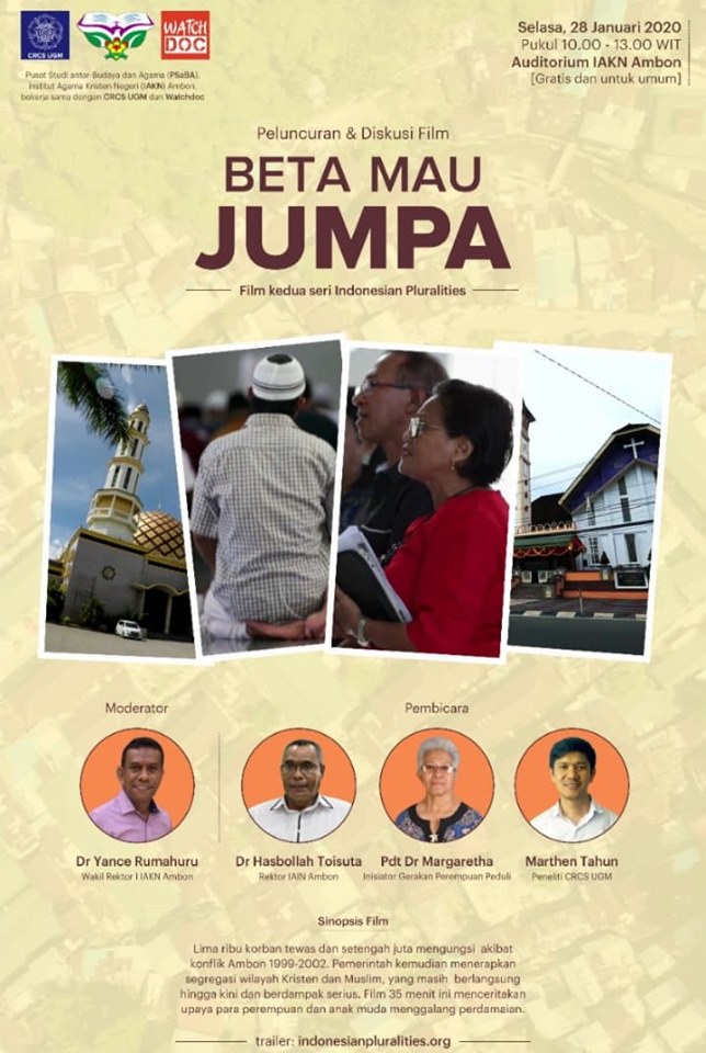 AMBON,MRNews.com,- Pusat Studi Antar-Budaya dan Agama (PSaBA) IAKN Ambon bekerjasama dengan Program Studi Agama dan Lintas Budaya (Center for Religious and Cross-cultural Studies atau CRCS) Sekolah Pascasarjana UGM serta Watchdoc Documentary akan menghadirkan atau launching film tentang Ambon “Beta Mau Jumpa” sekaligus diskusi film tersebut, Selasa (28/1/2020).