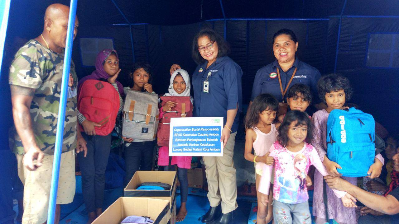 AMBON,MRNew, com. – BPJS Kesehatan Cabang Ambon memberikan bantuan kepada Korban Kebakaran Lorong Sedap Malam, Kamis (24/1/19). Kebakaran yang diduga akibat korsleting listrik itu terjadi pada Selasa 08 Januari 2019 lalu. Api melahap 3 bangunan kos dan 1 rumah warga yang dihuni sebanyak 76 KK atau 244 jiwa serta menewaskan 2 orang bocah. Bantuan berupa perlengkapan sekolah seperti seragam, sepatu, tas, dan alat tulis diserahkan langsung oleh Kepala BPJS Kesehatan Cabang Ambon, Afliana Latumakulita kepada korban yang diwakili Ketua RT 04/01 Benny Rutumallessy di tenda pengungsian.