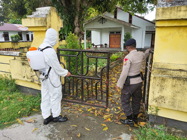 “Penyemprotan disinfektan yang dilakukan personil di Gereja Katolik Fransiskus Xaverius sebagai upaya sterilisasi dan pencegahan agar masyarakat terutama umat yang akan beribadah besok (hari ini-red) tidak terkontaminasi virus,” kata Agung.