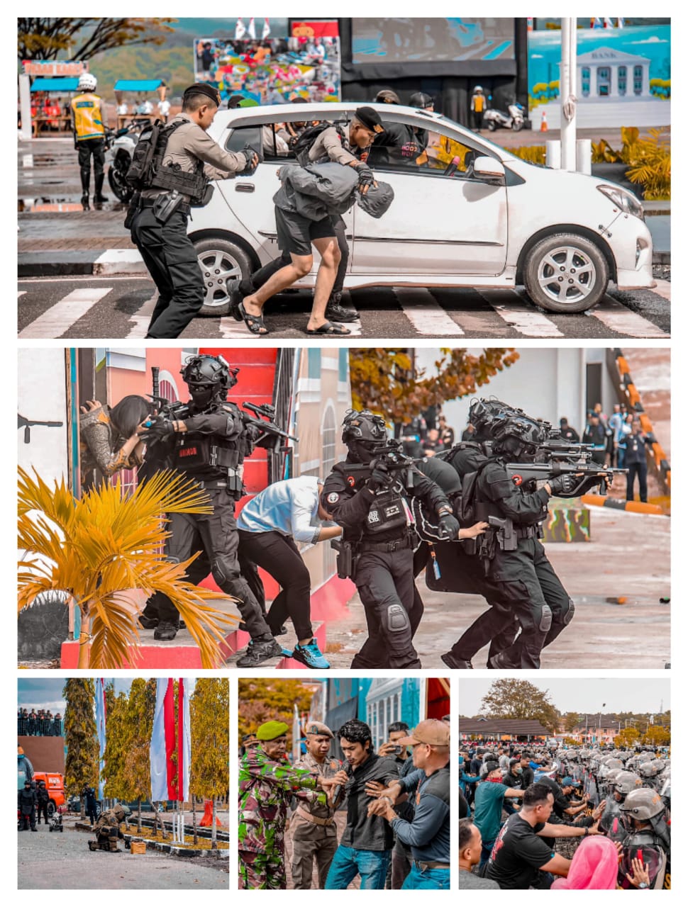 Keberhasilan tim aksi khusus dalam melumpuhkan pelaku teror dan membebaskan para tawanan ini, terlihat dalam peragaan simulasi pengamanan Pemilu tahun 2023-2024 yang dihelat di Lapangan Letkol Pol Chr Tahapary, Kota Ambon.