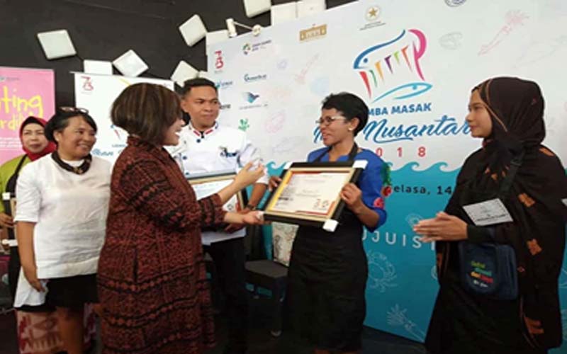 AMBON,MRNews.com,- Peserta asal Kota Ambon, Sientje Toumahu meraih juara II pada ajang final Lomba Masak Ikan Nusantara (LMIN) dalam rangka menuju Istana, yang diselenggarakan oleh Kantor Staf Kepresidenan bekerjasama dengan Primarasa dan situs masak Femina Grup, di restoran Bandar Djakarta, Selasa (14/8/18).