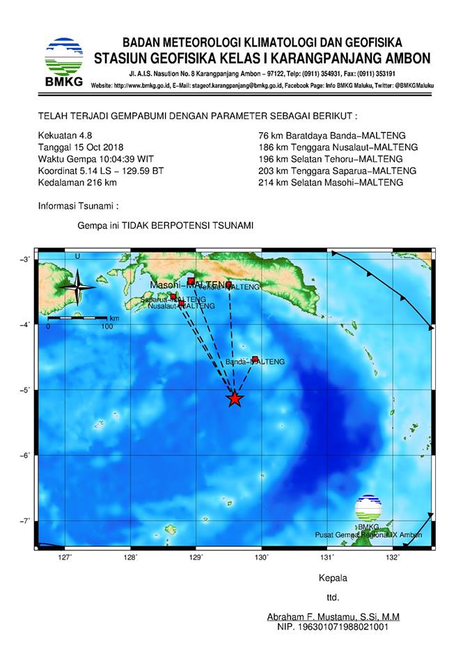 AMBON,MRNews.com,- Gempa bumi berkekuatan 4,8 skala richter (SR) kembali mengguncang pulau Banda, Kabupaten Maluku Tengah (Malteng), Senin (15/10/18) pagi tepat pukul 10.04.39 WIT.