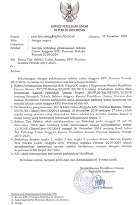 AMBON,MRNews.com,- Komisi Pemilihan Umum (KPU) RI meminta kepada tim seleksi (Timsel) calon anggota KPU Provinsi Maluku periode 2019-2024 untuk menghentikan sementara proses seleksi berikutnya sampai dengan adanya keputusan lebih lanjut dari KPU. Hal itu ditegaskan Ketua KPU RI, Arief Budiman dalam suratnya yang bersifat sangat segera perihal koreksi terhadap pelaksanaan seleksi ditujukan kepada ketua Timsel calon anggota KPU Maluku periode 2019-2024 nomor 1457/PP.06-SD/05/KPU/XI/2018 tertanggal 27 November 2018, yang telah beredar di jejaring media sosial dan didapat media ini, Rabu (28/11/18) malam.