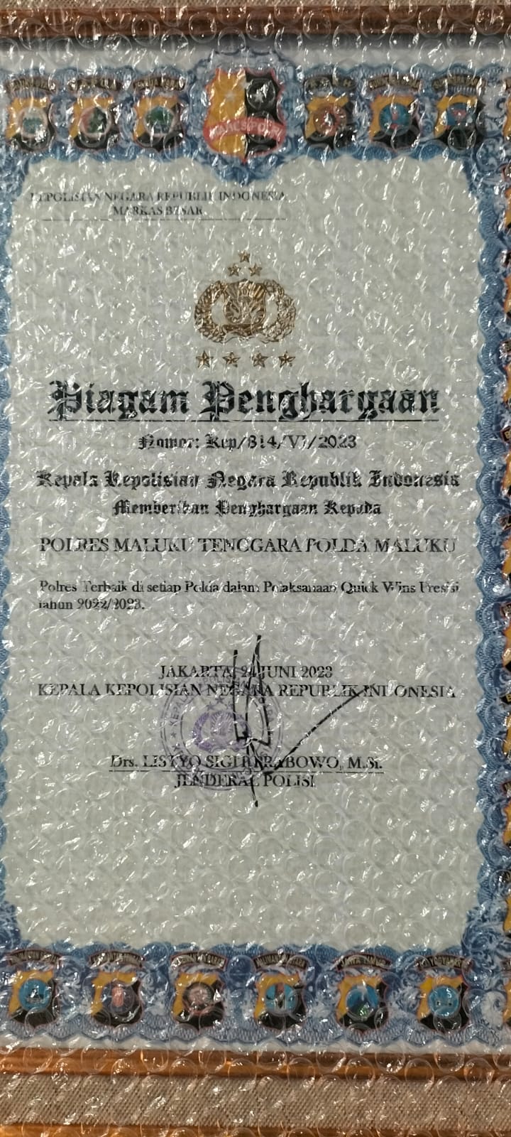 AMBON,MRNews.com,- Sebagai pelaksana Quick Wins Presisi terbaik di Polda Maluku periode 2022-2023, Kapolri Jenderal Polisi Listyo Sigit Prabowo pun memberikan penghargaan kepada Kepolisian Resor Maluku Tenggara (Malra).