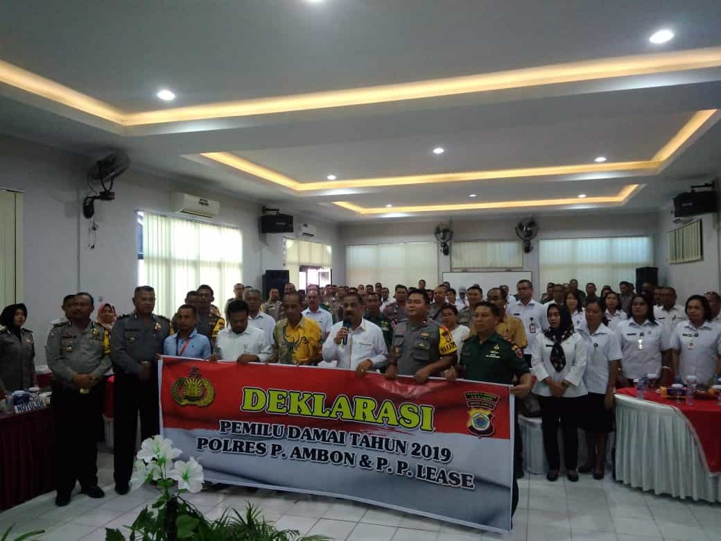 Deklarasi ini dilakukan bertepatan dengan focus group discussion (FGD) yang dilakukan oleh Polres Pulau Ambon dan P.p Lease dengan tema kumpul orang basudara bacarita Kamtibmas dan Pemilu 2019 yang aman, tertib deng sajo-sajo di aula Mapolres Pulau Ambon, Rabu (27/2/19).