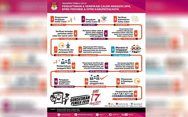 “Pengajuan penggantian Bacaleg DPRD pada 4-10 September 2018. Tahapan selanjutnya, verifikasi pengganti DCS kepada KPU 11-13 September 2018, penyusunan daftar calon tetap (DCT) 14-20 September 2018, dilanjutkan dengan penetapan DCT 20 September 2018. Selanjutnya pengumuman DCT anggota DPRD 21-23 September 2018 dan tahap terakhir adalah penetapan dan pengumuman DCT 20-23 September 2018,” tutupnya.