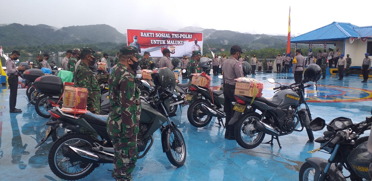 Bantuan sosial TNI-Polri kepada masyarakat itu diserahkan secara simbolis oleh Kapolda Maluku Irjen Pol Baharudin Djafar dan Pangdam XVI Patimura Mayjen TNI Marga Taufiq kepada para Bhabinkamtibmas dan Babinsa di Dermaga Pelabuhan Dit Polairud Polda Maluku di Lateri, Selasa (28/4/20).