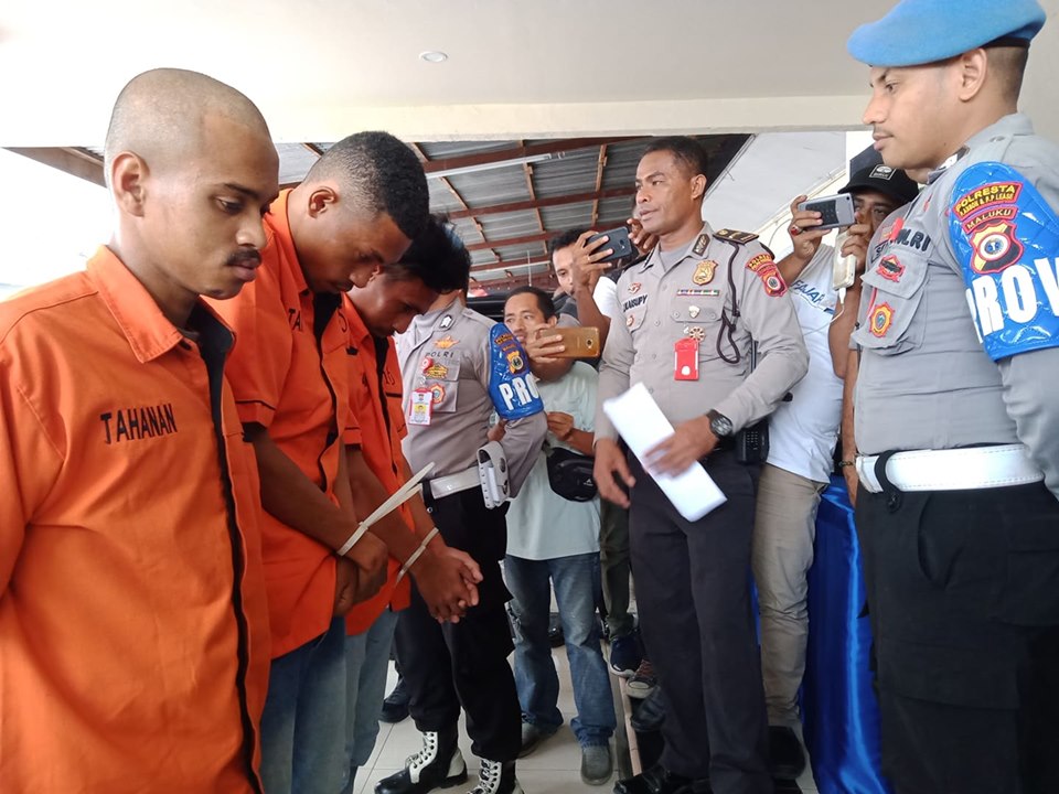 “Hasil pengembangan dan pencarian para pelaku lewat pemeriksaan para saksi maka oleh anggota kami di lapangan, Satreskrim dan dibackup anggota satuan intelijen, maka hasilnya hari ini seluruh tersangka sebanyak tiga orang sudah tertangkap. Penangkapan ini juga berbeda-beda waktunya,” kata Kapolresta Pulau Ambon dan Pp Lease AKBP Leo Simatupang saat rilis kasus di halaman Mapolresta Ambon, Jumat (13/12/19).